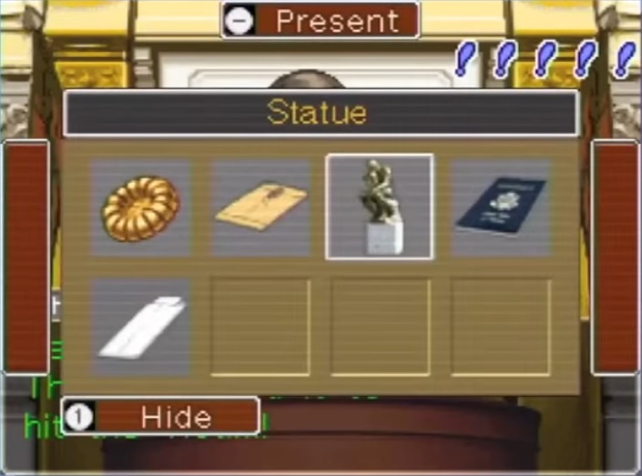 | Use all of your evidence to catch the culprit! Sometimes, the court record's pile of evidence will get pretty damn weird. Especially in Apollo Justice. |